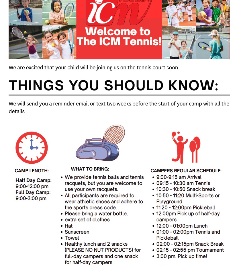 In case of any questions, please contact our tennis coordinator, Sarah, via the email address of: info@icmtennis.com, +16477870704